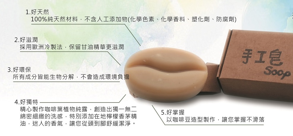 【成分】橄欖油、椰子油、棕櫚油、箆麻油、乳油木果脂、荷荷巴油、新鮮咖啡蒸餾、氫氧化鈉、天然蜂蠟。